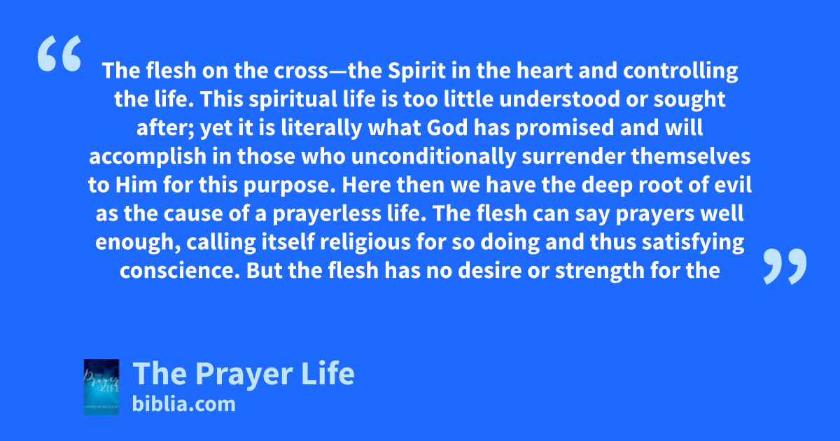 The flesh on the cross—the Spirit in the heart and controlling the life. This spiritual life is too little understood or sought after; yet it is literally what God has promised and will accomplish in those who unconditionally surrender themselves to Him for this purpose. Here then we have the deep root of evil as the cause of a prayerless life. The flesh can say prayers well enough, calling itself religious for so doing and thus satisfying conscience. But the flesh has no desire or strength for the