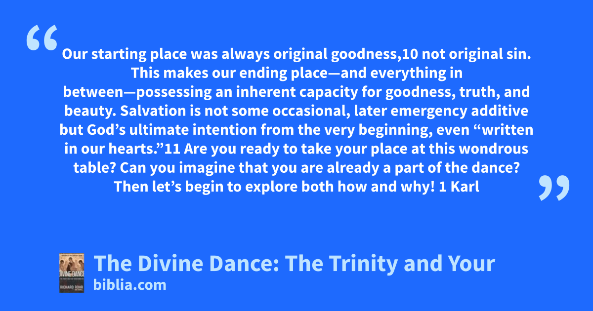 Our starting place was always original goodness,10 not original sin. This makes our ending place—and everything in between—possessing an inherent capacity for goodness, truth, and beauty. Salvation is not some occasional, later emergency additive but God’s ultimate intention from the very beginning, even “written in our hearts.”11 Are you ready to take your place at this wondrous table? Can you imagine that you are already a part of the dance? Then let’s begin to explore both how and why! 1 Karl