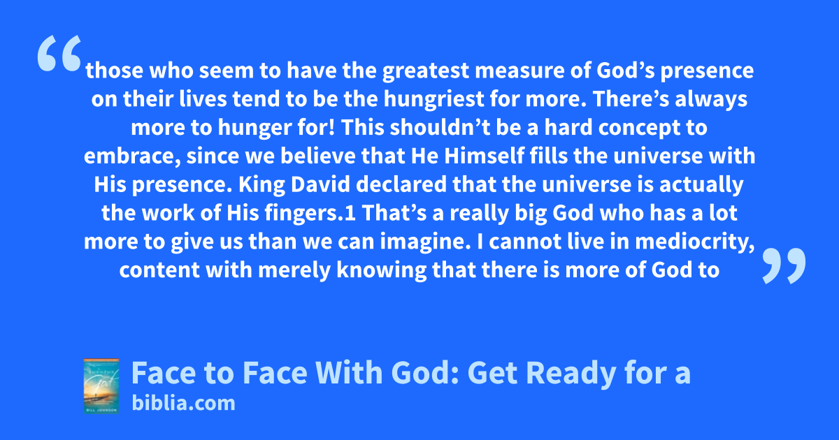 those who seem to have the greatest measure of God’s presence on their lives tend to be the hungriest for more. There’s always more to hunger for! This shouldn’t be a hard concept to embrace, since we believe that He Himself fills the universe with His presence. King David declared that the universe is actually the work of His fingers.1 That’s a really big God who has a lot more to give us than we can imagine. I cannot live in mediocrity, content with merely knowing that there is more of God to
