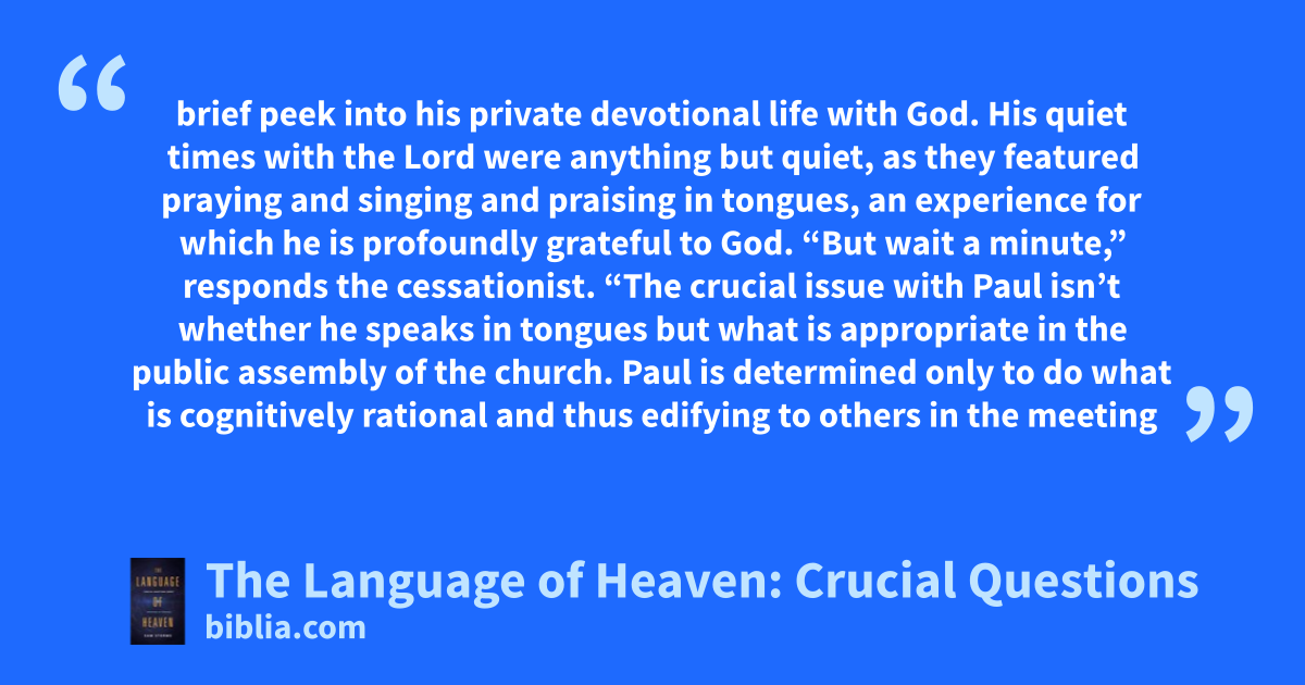 brief peek into his private devotional life with God. His quiet times with the Lord were anything but quiet, as they featured praying and singing and praising in tongues, an experience for which he is profoundly grateful to God. “But wait a minute,” responds the cessationist. “The crucial issue with Paul isn’t whether he speaks in tongues but what is appropriate in the public assembly of the church. Paul is determined only to do what is cognitively rational and thus edifying to others in the meeting