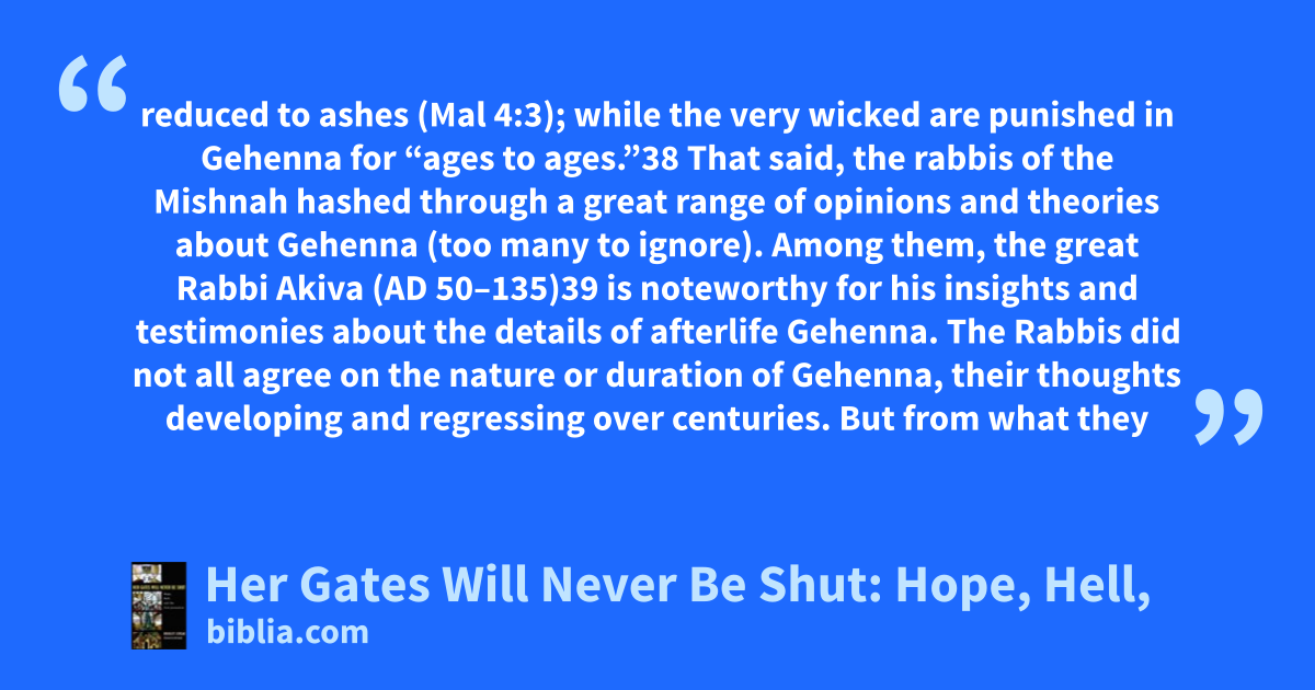 reduced to ashes (Mal 4:3); while the very wicked are punished in Gehenna for “ages to ages.”38 That said, the rabbis of the Mishnah hashed through a great range of opinions and theories about Gehenna (too many to ignore). Among them, the great Rabbi Akiva (AD 50–135)39 is noteworthy for his insights and testimonies about the details of afterlife Gehenna. The Rabbis did not all agree on the nature or duration of Gehenna, their thoughts developing and regressing over centuries. But from what they