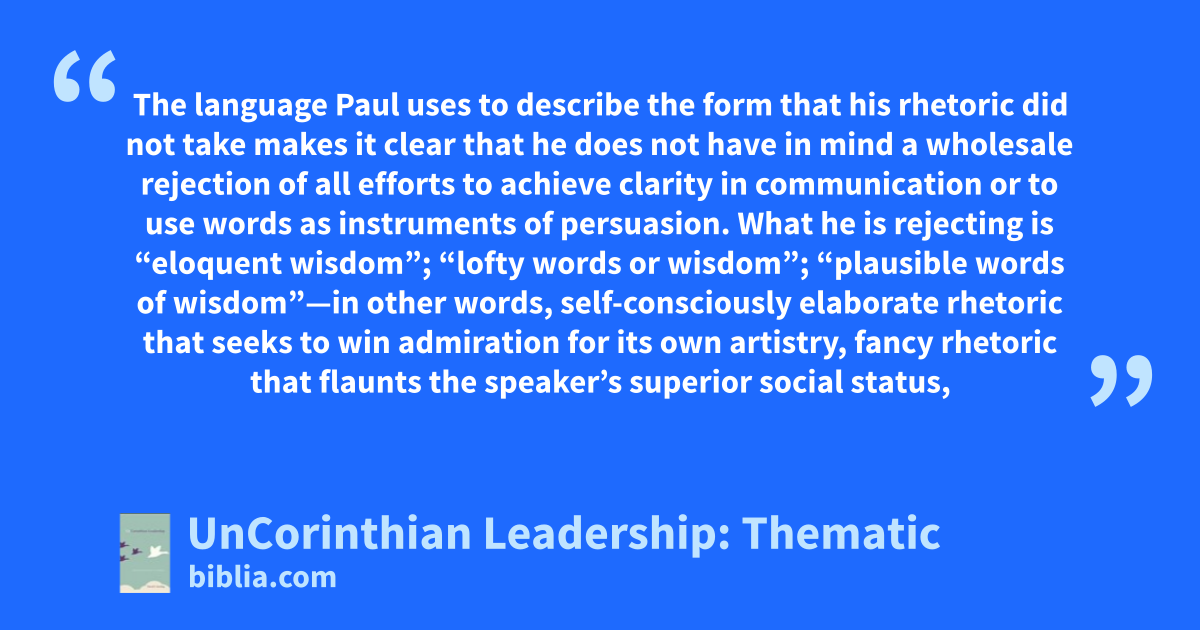 The language Paul uses to describe the form that his rhetoric did not take makes it clear that he does not have in mind a wholesale rejection of all efforts to achieve clarity in communication or to use words as instruments of persuasion. What he is rejecting is “eloquent wisdom”; “lofty words or wisdom”; “plausible words of wisdom”—in other words, self-consciously elaborate rhetoric that seeks to win admiration for its own artistry, fancy rhetoric that flaunts the speaker’s superior social status,