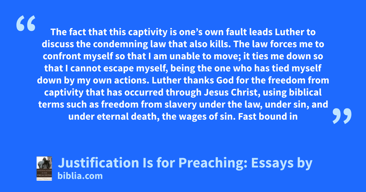 The fact that this captivity is one’s own fault leads Luther to discuss the condemning law that also kills. The law forces me to confront myself so that I am unable to move; it ties me down so that I cannot escape myself, being the one who has tied myself down by my own actions. Luther thanks God for the freedom from captivity that has occurred through Jesus Christ, using biblical terms such as freedom from slavery under the law, under sin, and under eternal death, the wages of sin. Fast bound in