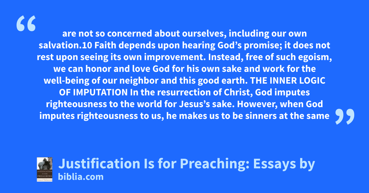 are not so concerned about ourselves, including our own salvation.10 Faith depends upon hearing God’s promise; it does not rest upon seeing its own improvement. Instead, free of such egoism, we can honor and love God for his own sake and work for the well-being of our neighbor and this good earth. THE INNER LOGIC OF IMPUTATION In the resurrection of Christ, God imputes righteousness to the world for Jesus’s sake. However, when God imputes righteousness to us, he makes us to be sinners at the same