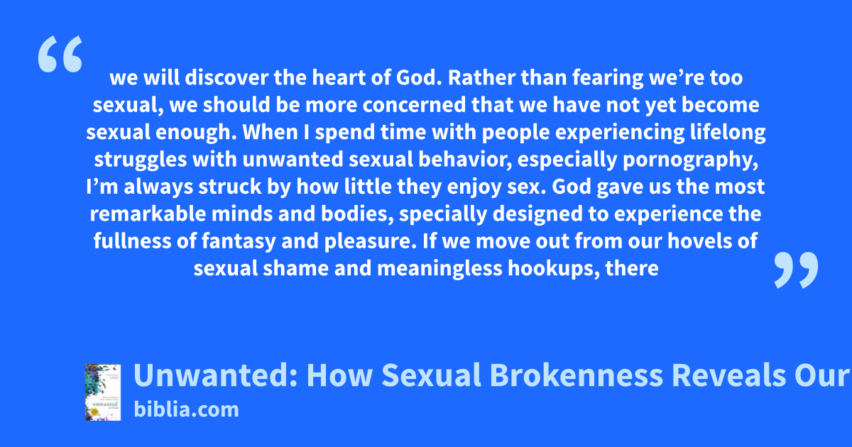 we will discover the heart of God. Rather than fearing we’re too sexual, we should be more concerned that we have not yet become sexual enough. When I spend time with people experiencing lifelong struggles with unwanted sexual behavior, especially pornography, I’m always struck by how little they enjoy sex. God gave us the most remarkable minds and bodies, specially designed to experience the fullness of fantasy and pleasure. If we move out from our hovels of sexual shame and meaningless hookups, there