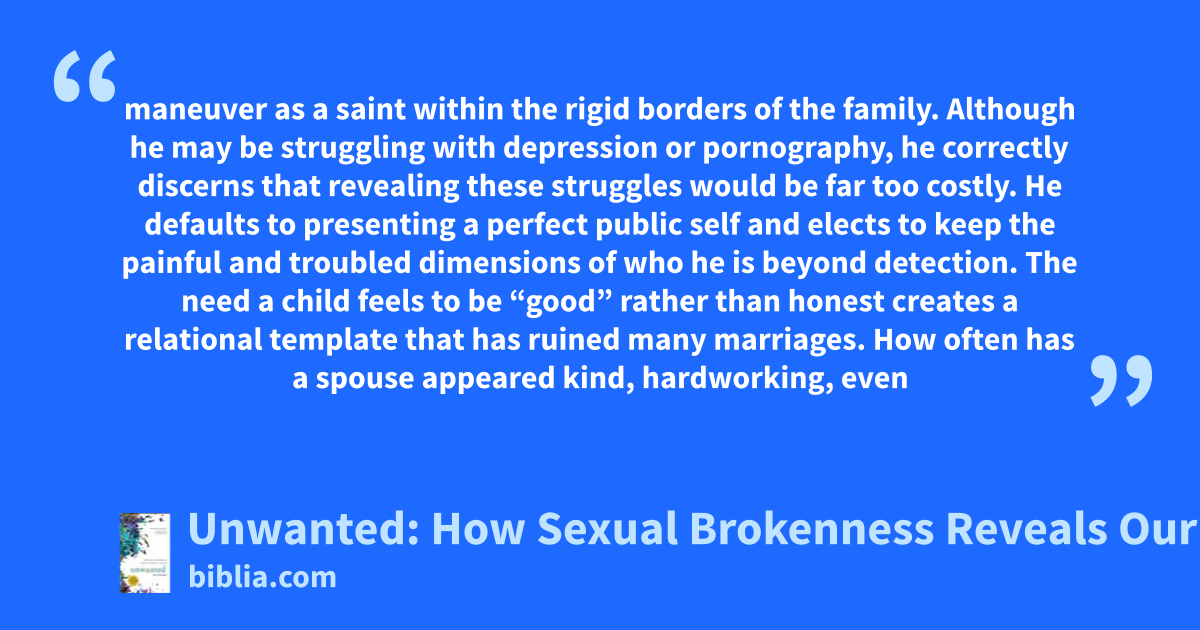 maneuver as a saint within the rigid borders of the family. Although he may be struggling with depression or pornography, he correctly discerns that revealing these struggles would be far too costly. He defaults to presenting a perfect public self and elects to keep the painful and troubled dimensions of who he is beyond detection. The need a child feels to be “good” rather than honest creates a relational template that has ruined many marriages. How often has a spouse appeared kind, hardworking, even