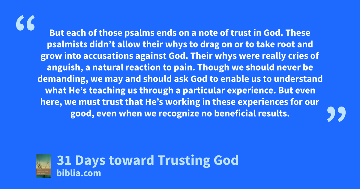 But each of those psalms ends on a note of trust in God. These psalmists didn’t allow their whys to drag on or to take root and grow into accusations against God. Their whys were really cries of anguish, a natural reaction to pain. Though we should never be demanding, we may and should ask God to enable us to understand what He’s teaching us through a particular experience. But even here, we must trust that He’s working in these experiences for our good, even when we recognize no beneficial results.