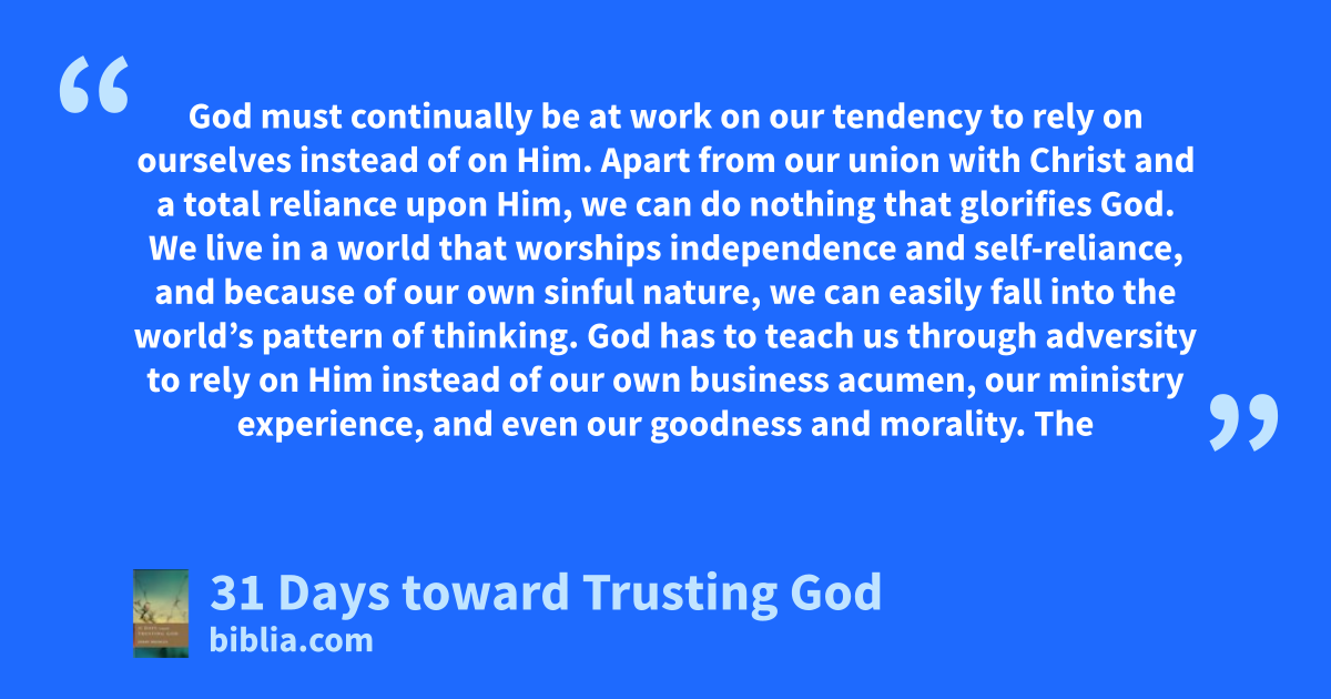 God must continually be at work on our tendency to rely on ourselves instead of on Him. Apart from our union with Christ and a total reliance upon Him, we can do nothing that glorifies God. We live in a world that worships independence and self-reliance, and because of our own sinful nature, we can easily fall into the world’s pattern of thinking. God has to teach us through adversity to rely on Him instead of our own business acumen, our ministry experience, and even our goodness and morality. The