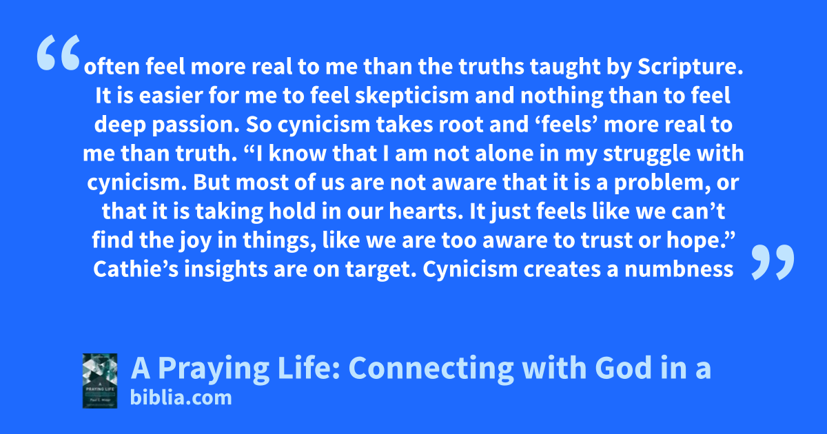 often feel more real to me than the truths taught by Scripture. It is easier for me to feel skepticism and nothing than to feel deep passion. So cynicism takes root and ‘feels’ more real to me than truth. “I know that I am not alone in my struggle with cynicism. But most of us are not aware that it is a problem, or that it is taking hold in our hearts. It just feels like we can’t find the joy in things, like we are too aware to trust or hope.” Cathie’s insights are on target. Cynicism creates a numbness