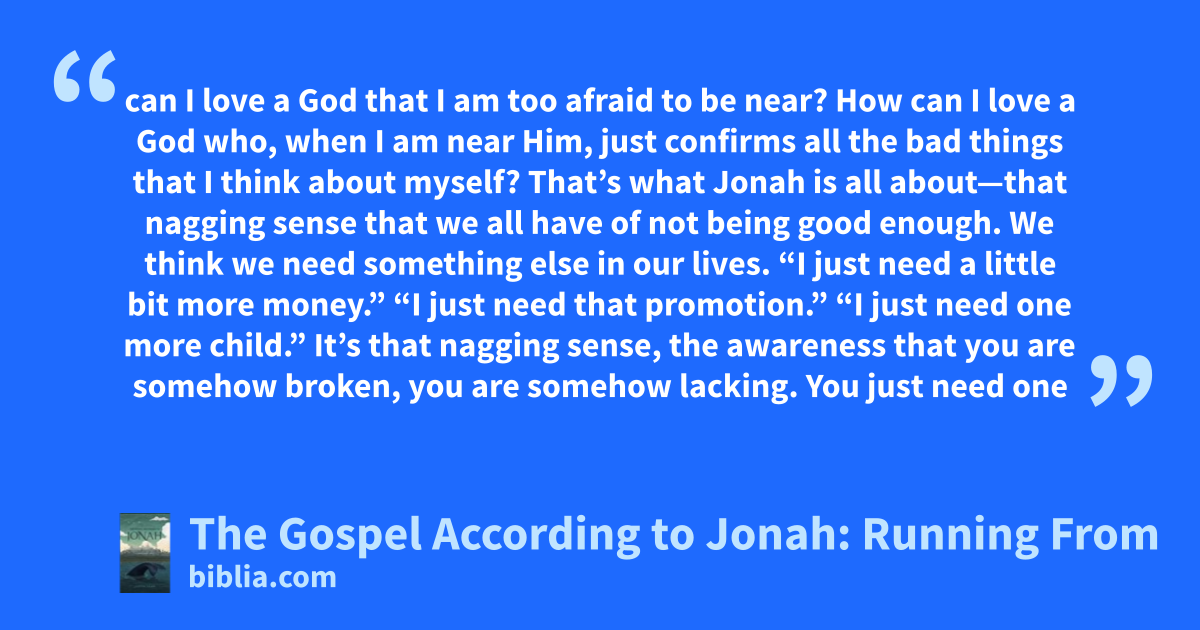 can I love a God that I am too afraid to be near? How can I love a God who, when I am near Him, just confirms all the bad things that I think about myself? That’s what Jonah is all about—that nagging sense that we all have of not being good enough. We think we need something else in our lives. “I just need a little bit more money.” “I just need that promotion.” “I just need one more child.” It’s that nagging sense, the awareness that you are somehow broken, you are somehow lacking. You just need one