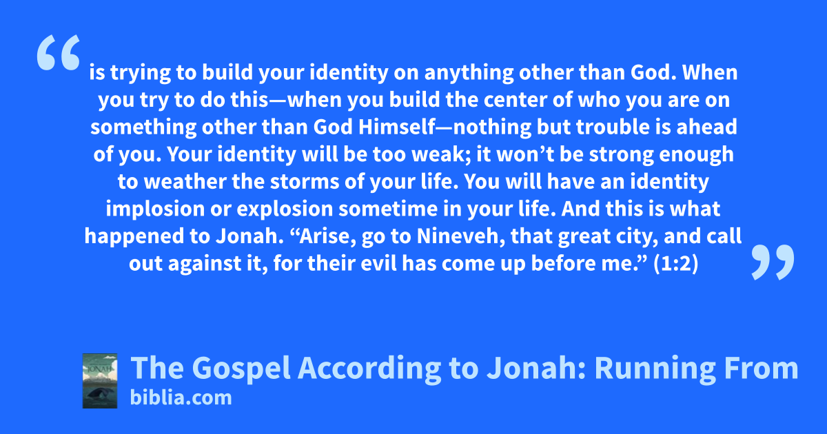 is trying to build your identity on anything other than God. When you try to do this—when you build the center of who you are on something other than God Himself—nothing but trouble is ahead of you. Your identity will be too weak; it won’t be strong enough to weather the storms of your life. You will have an identity implosion or explosion sometime in your life. And this is what happened to Jonah. “Arise, go to Nineveh, that great city, and call out against it, for their evil has come up before me.” (1:2)