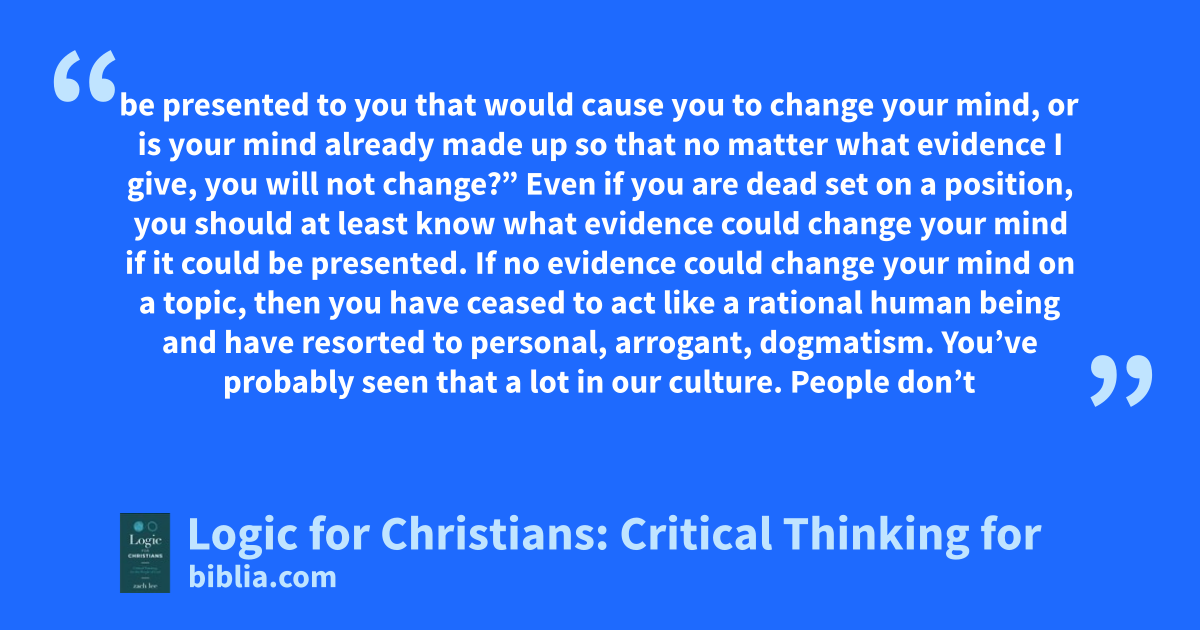 be presented to you that would cause you to change your mind, or is your mind already made up so that no matter what evidence I give, you will not change?” Even if you are dead set on a position, you should at least know what evidence could change your mind if it could be presented. If no evidence could change your mind on a topic, then you have ceased to act like a rational human being and have resorted to personal, arrogant, dogmatism. You’ve probably seen that a lot in our culture. People don’t
