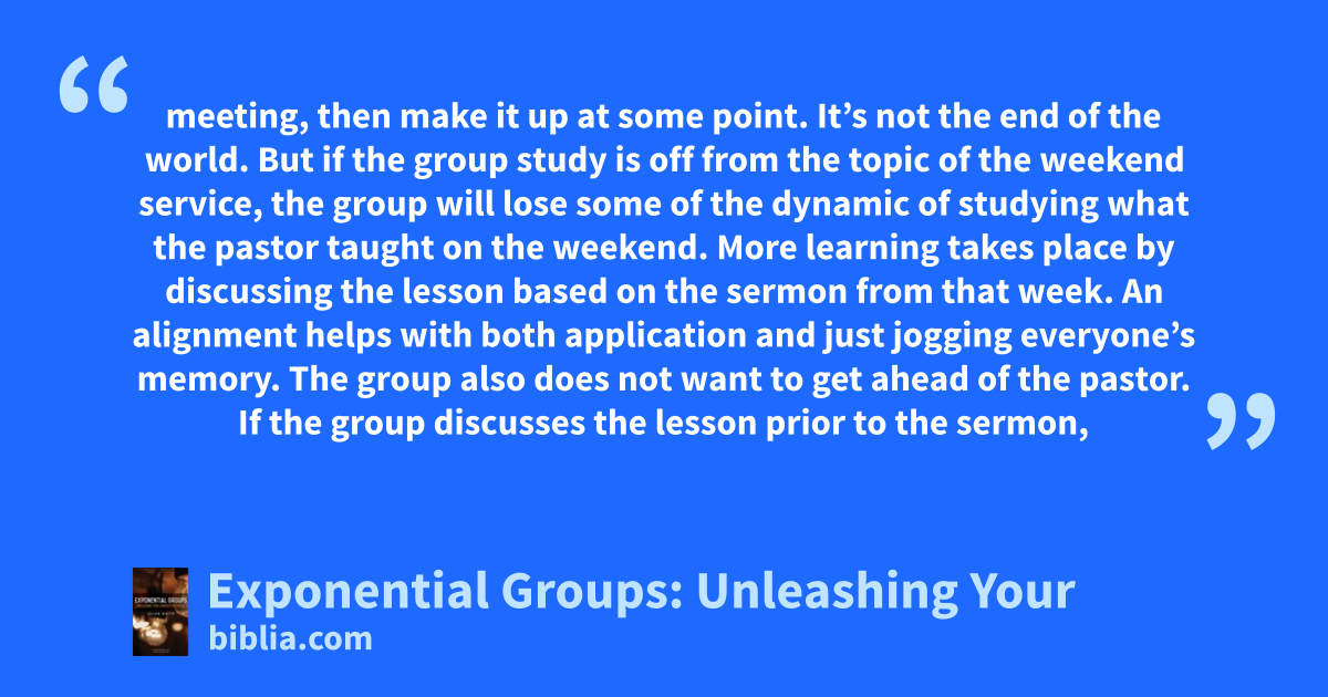 meeting, then make it up at some point. It’s not the end of the world. But if the group study is off from the topic of the weekend service, the group will lose some of the dynamic of studying what the pastor taught on the weekend. More learning takes place by discussing the lesson based on the sermon from that week. An alignment helps with both application and just jogging everyone’s memory. The group also does not want to get ahead of the pastor. If the group discusses the lesson prior to the sermon,