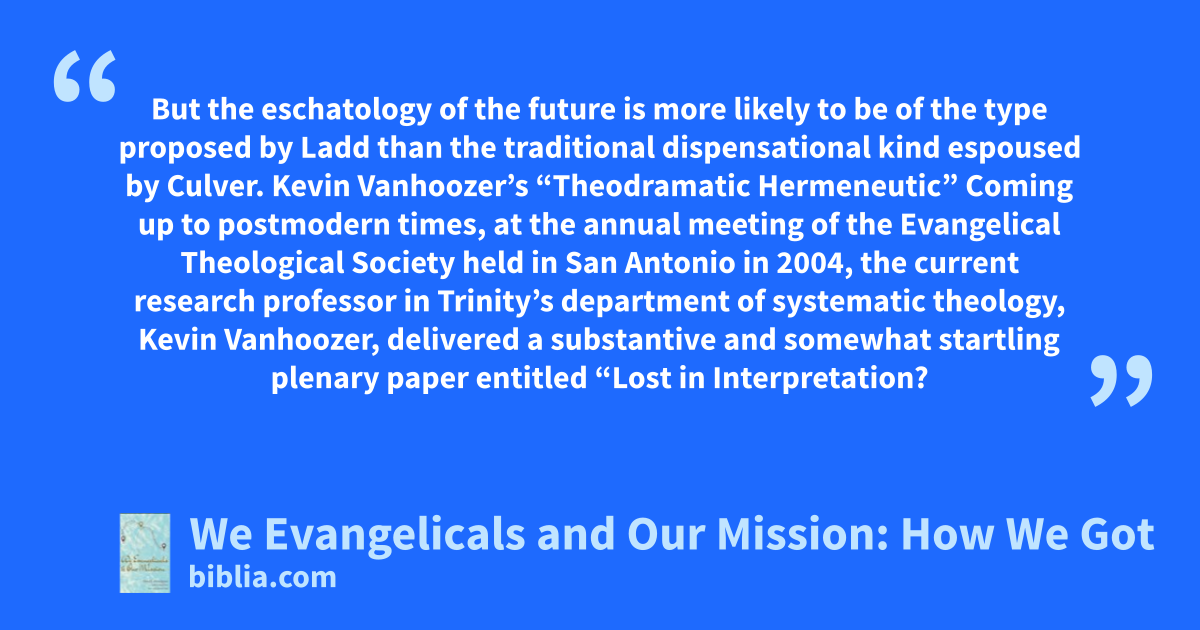 But the eschatology of the future is more likely to be of the type proposed by Ladd than the traditional dispensational kind espoused by Culver. Kevin Vanhoozer’s “Theodramatic Hermeneutic” Coming up to postmodern times, at the annual meeting of the Evangelical Theological Society held in San Antonio in 2004, the current research professor in Trinity’s department of systematic theology, Kevin Vanhoozer, delivered a substantive and somewhat startling plenary paper entitled “Lost in Interpretation?