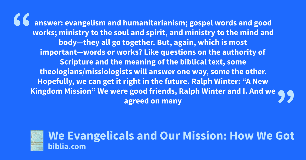 answer: evangelism and humanitarianism; gospel words and good works; ministry to the soul and spirit, and ministry to the mind and body—they all go together. But, again, which is most important—words or works? Like questions on the authority of Scripture and the meaning of the biblical text, some theologians/missiologists will answer one way, some the other. Hopefully, we can get it right in the future. Ralph Winter: “A New Kingdom Mission” We were good friends, Ralph Winter and I. And we agreed on many