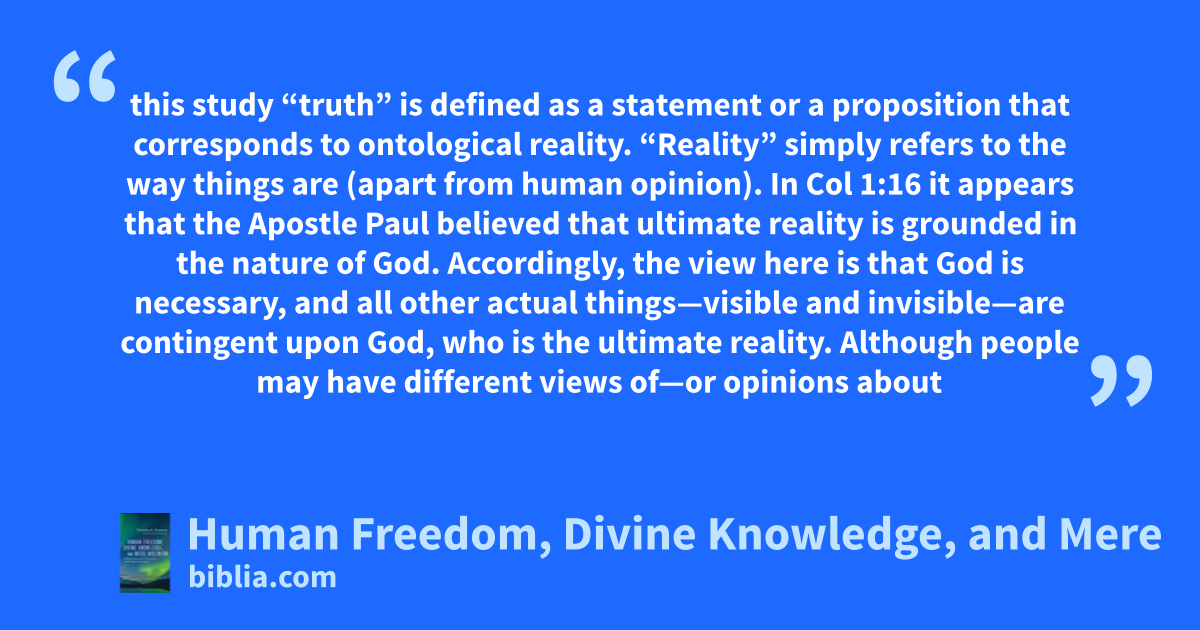 this study “truth” is defined as a statement or a proposition that corresponds to ontological reality. “Reality” simply refers to the way things are (apart from human opinion). In Col 1:16 it appears that the Apostle Paul believed that ultimate reality is grounded in the nature of God. Accordingly, the view here is that God is necessary, and all other actual things—visible and invisible—are contingent upon God, who is the ultimate reality. Although people may have different views of—or opinions about