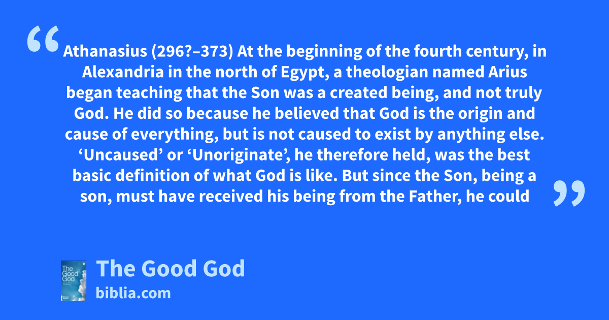 Athanasius (296?–373) At the beginning of the fourth century, in Alexandria in the north of Egypt, a theologian named Arius began teaching that the Son was a created being, and not truly God. He did so because he believed that God is the origin and cause of everything, but is not caused to exist by anything else. ‘Uncaused’ or ‘Unoriginate’, he therefore held, was the best basic definition of what God is like. But since the Son, being a son, must have received his being from the Father, he could