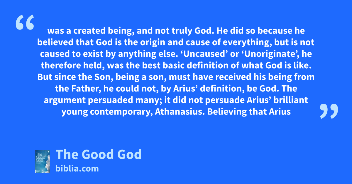 was a created being, and not truly God. He did so because he believed that God is the origin and cause of everything, but is not caused to exist by anything else. ‘Uncaused’ or ‘Unoriginate’, he therefore held, was the best basic definition of what God is like. But since the Son, being a son, must have received his being from the Father, he could not, by Arius’ definition, be God. The argument persuaded many; it did not persuade Arius’ brilliant young contemporary, Athanasius. Believing that Arius