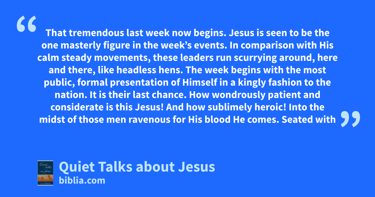 That tremendous last week now begins. Jesus is seen to be the one masterly figure in the week’s events. In comparison with His calm steady movements, these leaders run scurrying around, here and there, like headless hens. The week begins with the most public, formal presentation of Himself in a kingly fashion to the nation. It is their last chance. How wondrously patient and considerate is this Jesus! And how sublimely heroic! Into the midst of those men ravenous for His blood He comes. Seated with