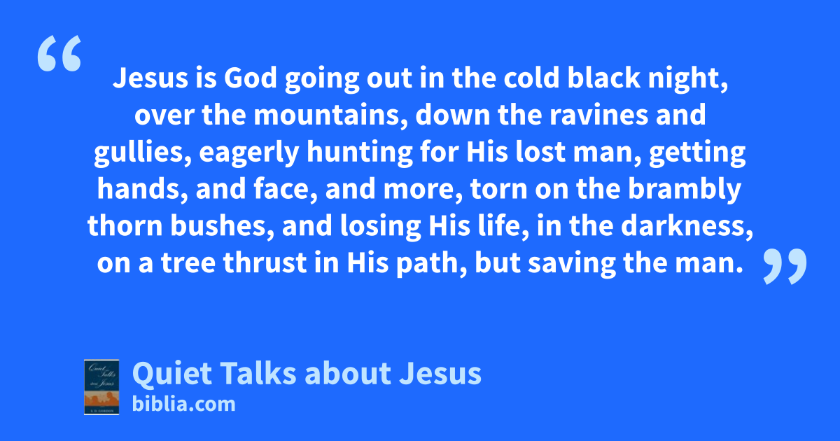 Jesus is God going out in the cold black night, over the mountains, down the ravines and gullies, eagerly hunting for His lost man, getting hands, and face, and more, torn on the brambly thorn bushes, and losing His life, in the darkness, on a tree thrust in His path, but saving the man.