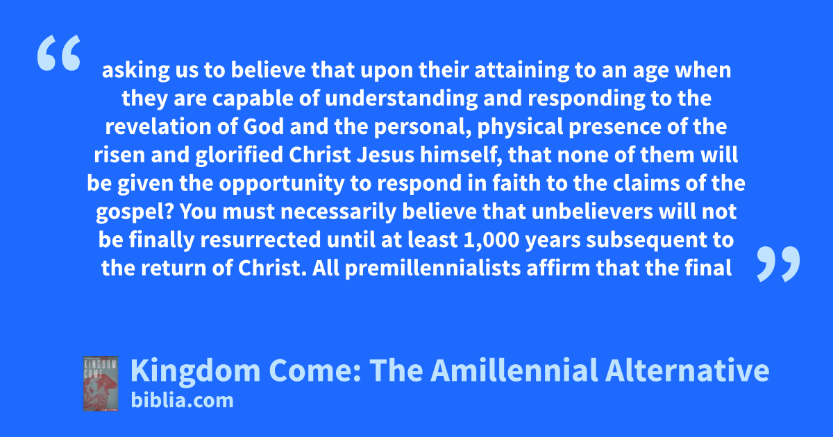 asking us to believe that upon their attaining to an age when they are capable of understanding and responding to the revelation of God and the personal, physical presence of the risen and glorified Christ Jesus himself, that none of them will be given the opportunity to respond in faith to the claims of the gospel? You must necessarily believe that unbelievers will not be finally resurrected until at least 1,000 years subsequent to the return of Christ. All premillennialists affirm that the final