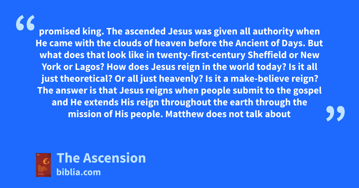 promised king. The ascended Jesus was given all authority when He came with the clouds of heaven before the Ancient of Days. But what does that look like in twenty-first-century Sheffield or New York or Lagos? How does Jesus reign in the world today? Is it all just theoretical? Or all just heavenly? Is it a make-believe reign? The answer is that Jesus reigns when people submit to the gospel and He extends His reign throughout the earth through the mission of His people. Matthew does not talk about