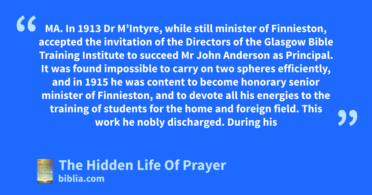 MA. In 1913 Dr M’Intyre, while still minister of Finnieston, accepted the invitation of the Directors of the Glasgow Bible Training Institute to succeed Mr John Anderson as Principal. It was found impossible to carry on two spheres efficiently, and in 1915 he was content to become honorary senior minister of Finnieston, and to devote all his energies to the training of students for the home and foreign field. This work he nobly discharged. During his
