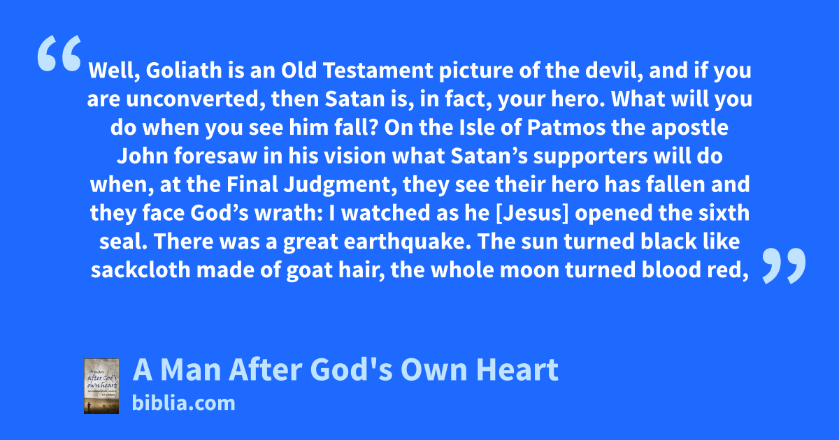 Well, Goliath is an Old Testament picture of the devil, and if you are unconverted, then Satan is, in fact, your hero. What will you do when you see him fall? On the Isle of Patmos the apostle John foresaw in his vision what Satan’s supporters will do when, at the Final Judgment, they see their hero has fallen and they face God’s wrath: I watched as he [Jesus] opened the sixth seal. There was a great earthquake. The sun turned black like sackcloth made of goat hair, the whole moon turned blood red,