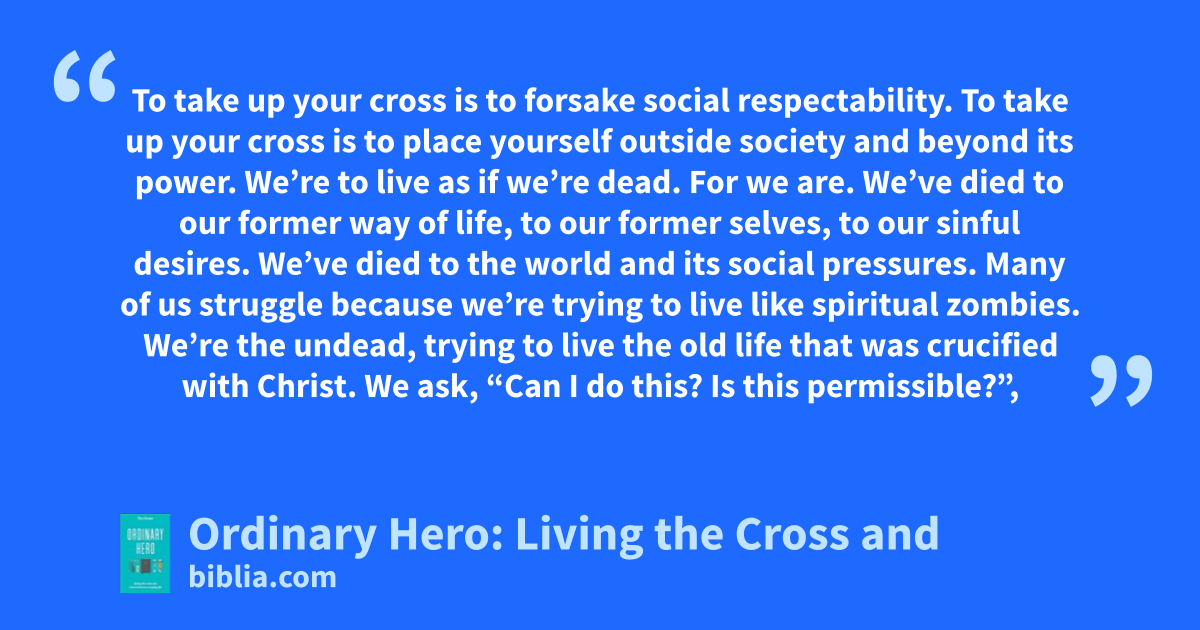 To take up your cross is to forsake social respectability. To take up your cross is to place yourself outside society and beyond its power. We’re to live as if we’re dead. For we are. We’ve died to our former way of life, to our former selves, to our sinful desires. We’ve died to the world and its social pressures. Many of us struggle because we’re trying to live like spiritual zombies. We’re the undead, trying to live the old life that was crucified with Christ. We ask, “Can I do this? Is this permissible?”,