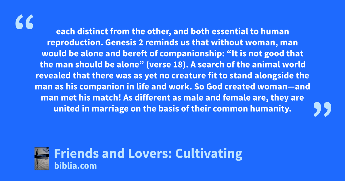 each distinct from the other, and both essential to human reproduction. Genesis 2 reminds us that without woman, man would be alone and bereft of companionship: “It is not good that the man should be alone” (verse 18). A search of the animal world revealed that there was as yet no creature fit to stand alongside the man as his companion in life and work. So God created woman—and man met his match! As different as male and female are, they are united in marriage on the basis of their common humanity.