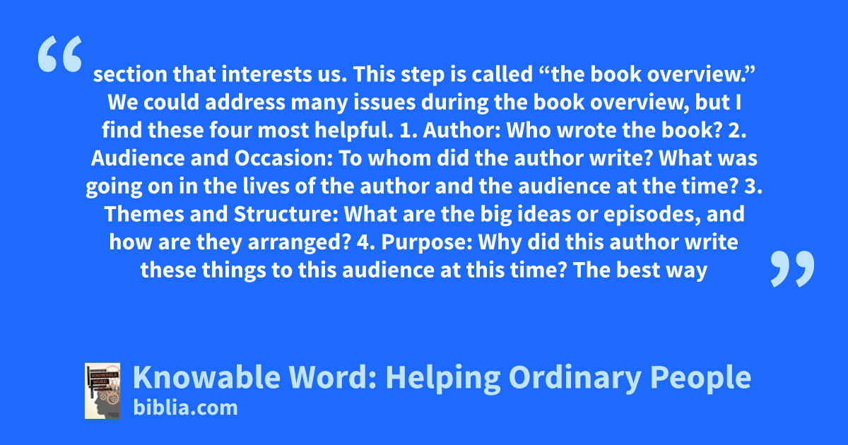section that interests us. This step is called “the book overview.” We could address many issues during the book overview, but I find these four most helpful. 1. Author: Who wrote the book? 2. Audience and Occasion: To whom did the author write? What was going on in the lives of the author and the audience at the time? 3. Themes and Structure: What are the big ideas or episodes, and how are they arranged? 4. Purpose: Why did this author write these things to this audience at this time? The best way