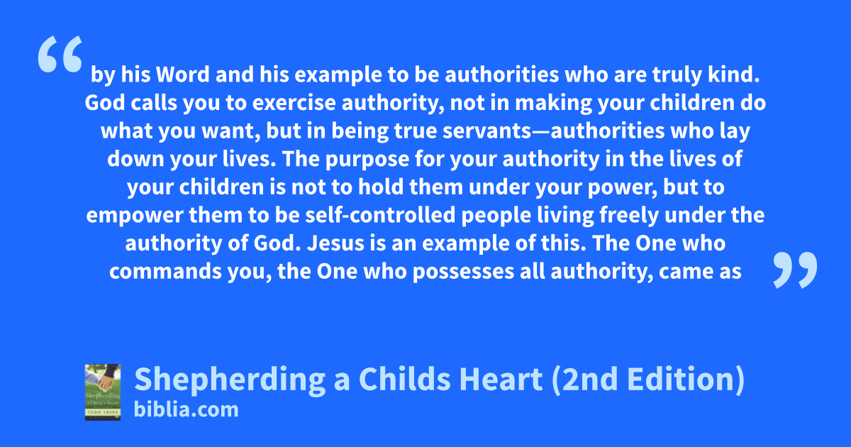 by his Word and his example to be authorities who are truly kind. God calls you to exercise authority, not in making your children do what you want, but in being true servants—authorities who lay down your lives. The purpose for your authority in the lives of your children is not to hold them under your power, but to empower them to be self-controlled people living freely under the authority of God. Jesus is an example of this. The One who commands you, the One who possesses all authority, came as