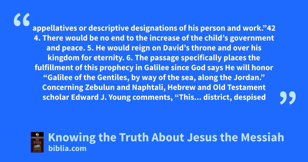 appellatives or descriptive designations of his person and work.”42 4. There would be no end to the increase of the child’s government and peace. 5. He would reign on David’s throne and over his kingdom for eternity. 6. The passage specifically places the fulfillment of this prophecy in Galilee since God says He will honor “Galilee of the Gentiles, by way of the sea, along the Jordan.” Concerning Zebulun and Naphtali, Hebrew and Old Testament scholar Edward J. Young comments, “This... district, despised