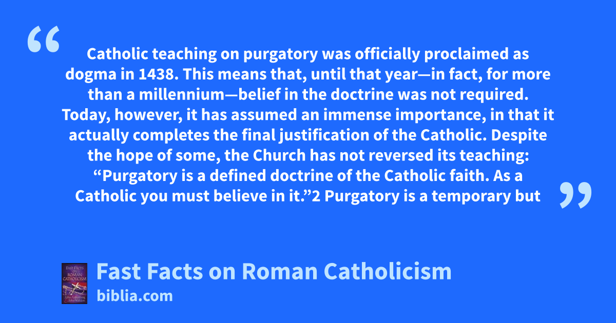 Catholic teaching on purgatory was officially proclaimed as dogma in 1438. This means that, until that year—in fact, for more than a millennium—belief in the doctrine was not required. Today, however, it has assumed an immense importance, in that it actually completes the final justification of the Catholic. Despite the hope of some, the Church has not reversed its teaching: “Purgatory is a defined doctrine of the Catholic faith. As a Catholic you must believe in it.”2 Purgatory is a temporary but