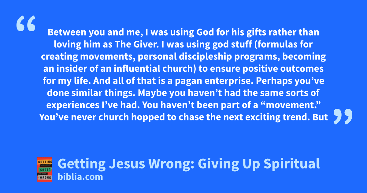 Between you and me, I was using God for his gifts rather than loving him as The Giver. I was using god stuff (formulas for creating movements, personal discipleship programs, becoming an insider of an influential church) to ensure positive outcomes for my life. And all of that is a pagan enterprise. Perhaps you’ve done similar things. Maybe you haven’t had the same sorts of experiences I’ve had. You haven’t been part of a “movement.” You’ve never church hopped to chase the next exciting trend. But