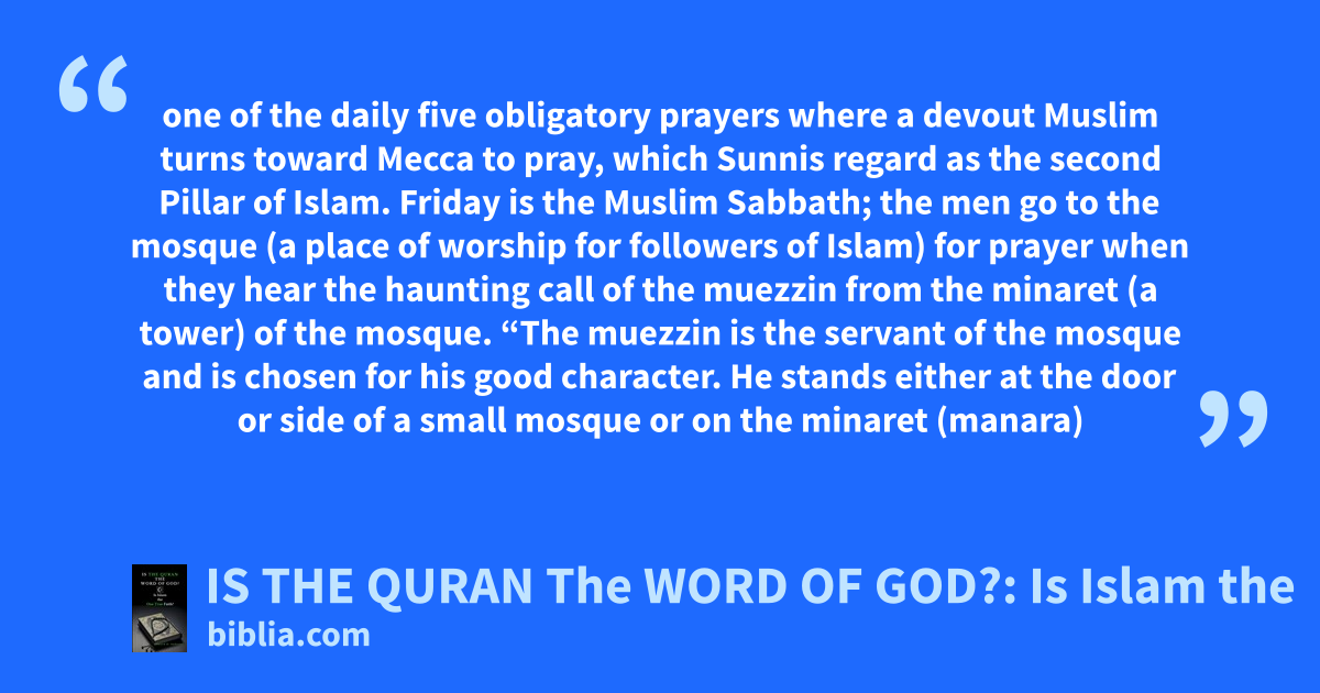 one of the daily five obligatory prayers where a devout Muslim turns toward Mecca to pray, which Sunnis regard as the second Pillar of Islam. Friday is the Muslim Sabbath; the men go to the mosque (a place of worship for followers of Islam) for prayer when they hear the haunting call of the muezzin from the minaret (a tower) of the mosque. “The muezzin is the servant of the mosque and is chosen for his good character. He stands either at the door or side of a small mosque or on the minaret (manara)