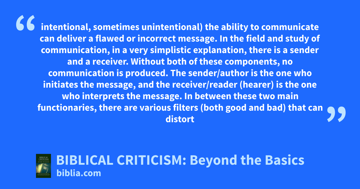 intentional, sometimes unintentional) the ability to communicate can deliver a flawed or incorrect message. In the field and study of communication, in a very simplistic explanation, there is a sender and a receiver. Without both of these components, no communication is produced. The sender/author is the one who initiates the message, and the receiver/reader (hearer) is the one who interprets the message. In between these two main functionaries, there are various filters (both good and bad) that can distort