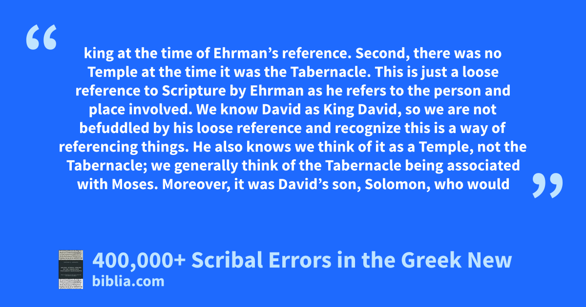 king at the time of Ehrman’s reference. Second, there was no Temple at the time it was the Tabernacle. This is just a loose reference to Scripture by Ehrman as he refers to the person and place involved. We know David as King David, so we are not befuddled by his loose reference and recognize this is a way of referencing things. He also knows we think of it as a Temple, not the Tabernacle; we generally think of the Tabernacle being associated with Moses. Moreover, it was David’s son, Solomon, who would