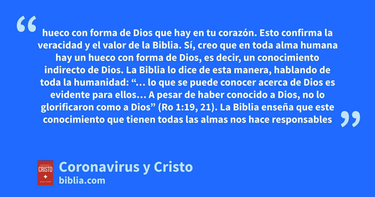 hueco con forma de Dios que hay en tu corazón. Esto confirma la veracidad y el valor de la Biblia. Sí, creo que en toda alma humana hay un hueco con forma de Dios, es decir, un conocimiento indirecto de Dios. La Biblia lo dice de esta manera, hablando de toda la humanidad: “… lo que se puede conocer acerca de Dios es evidente para ellos… A pesar de haber conocido a Dios, no lo glorificaron como a Dios” (Ro 1:19, 21). La Biblia enseña que este conocimiento que tienen todas las almas nos hace responsables