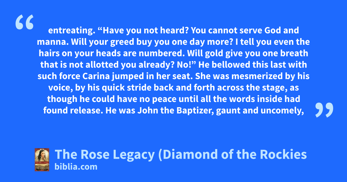 entreating. “Have you not heard? You cannot serve God and manna. Will your greed buy you one day more? I tell you even the hairs on your heads are numbered. Will gold give you one breath that is not allotted you already? No!” He bellowed this last with such force Carina jumped in her seat. She was mesmerized by his voice, by his quick stride back and forth across the stage, as though he could have no peace until all the words inside had found release. He was John the Baptizer, gaunt and uncomely,