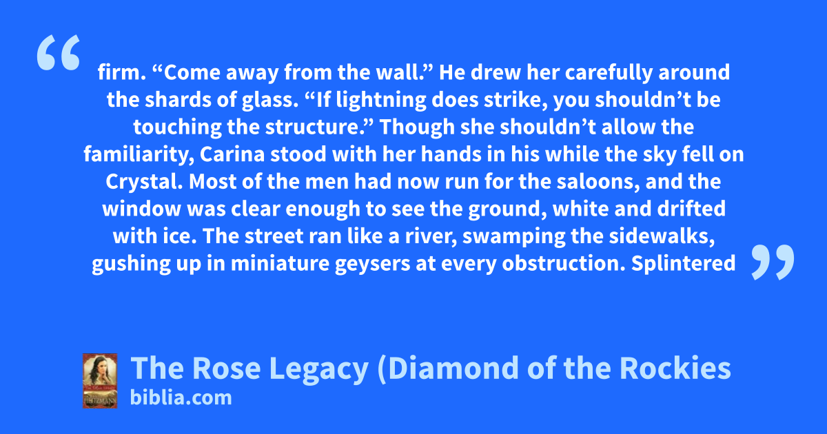 firm. “Come away from the wall.” He drew her carefully around the shards of glass. “If lightning does strike, you shouldn’t be touching the structure.” Though she shouldn’t allow the familiarity, Carina stood with her hands in his while the sky fell on Crystal. Most of the men had now run for the saloons, and the window was clear enough to see the ground, white and drifted with ice. The street ran like a river, swamping the sidewalks, gushing up in miniature geysers at every obstruction. Splintered