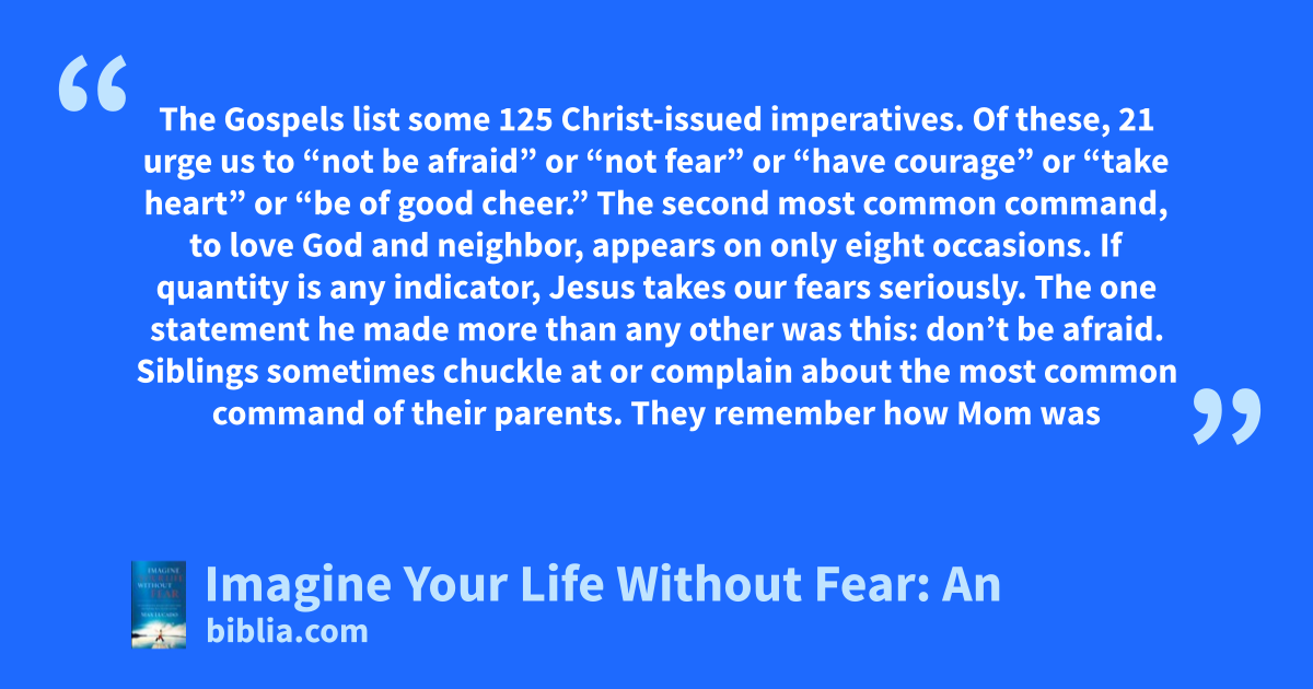 The Gospels list some 125 Christ-issued imperatives. Of these, 21 urge us to “not be afraid” or “not fear” or “have courage” or “take heart” or “be of good cheer.” The second most common command, to love God and neighbor, appears on only eight occasions. If quantity is any indicator, Jesus takes our fears seriously. The one statement he made more than any other was this: don’t be afraid. Siblings sometimes chuckle at or complain about the most common command of their parents. They remember how Mom was