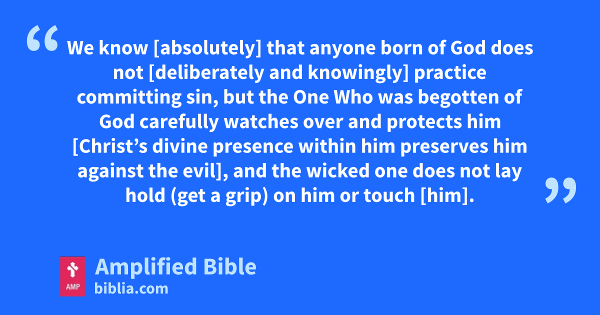 We know [absolutely] that anyone born of God does not [deliberately and knowingly] practice committing sin, but the One Who was begotten of God carefully watches over and protects him [Christ’s divine presence within him preserves him against the evil], and the wicked one does not lay hold (get a grip) on him or touch [him].