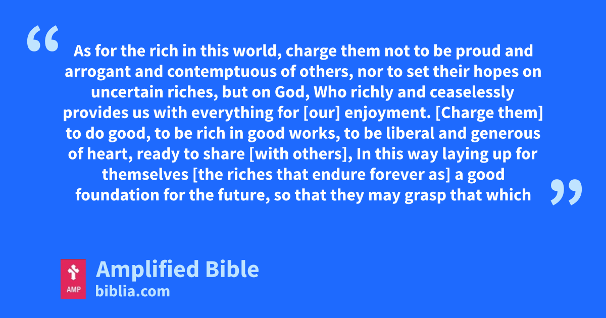 As for the rich in this world, charge them not to be proud and arrogant and contemptuous of others, nor to set their hopes on uncertain riches, but on God, Who richly and ceaselessly provides us with everything for [our] enjoyment. [Charge them] to do good, to be rich in good works, to be liberal and generous of heart, ready to share [with others], In this way laying up for themselves [the riches that endure forever as] a good foundation for the future, so that they may grasp that which