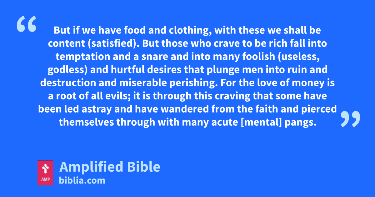 But if we have food and clothing, with these we shall be content (satisfied). But those who crave to be rich fall into temptation and a snare and into many foolish (useless, godless) and hurtful desires that plunge men into ruin and destruction and miserable perishing. For the love of money is a root of all evils; it is through this craving that some have been led astray and have wandered from the faith and pierced themselves through with many acute [mental] pangs.