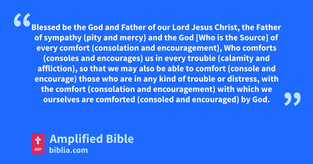 Blessed be the God and Father of our Lord Jesus Christ, the Father of sympathy (pity and mercy) and the God [Who is the Source] of every comfort (consolation and encouragement), Who comforts (consoles and encourages) us in every trouble (calamity and affliction), so that we may also be able to comfort (console and encourage) those who are in any kind of trouble or distress, with the comfort (consolation and encouragement) with which we ourselves are comforted (consoled and encouraged) by God.