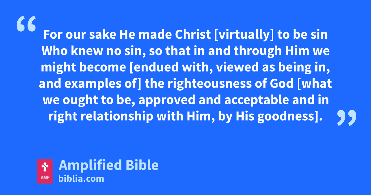 For our sake He made Christ [virtually] to be sin Who knew no sin, so that in and through Him we might become [endued with, viewed as being in, and examples of] the righteousness of God [what we ought to be, approved and acceptable and in right relationship with Him, by His goodness].