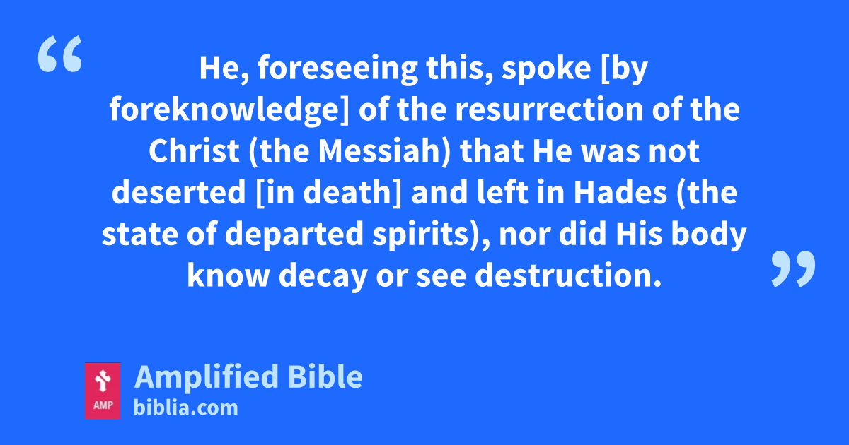 He, foreseeing this, spoke [by foreknowledge] of the resurrection of the Christ (the Messiah) that He was not deserted [in death] and left in Hades (the state of departed spirits), nor did His body know decay or see destruction.