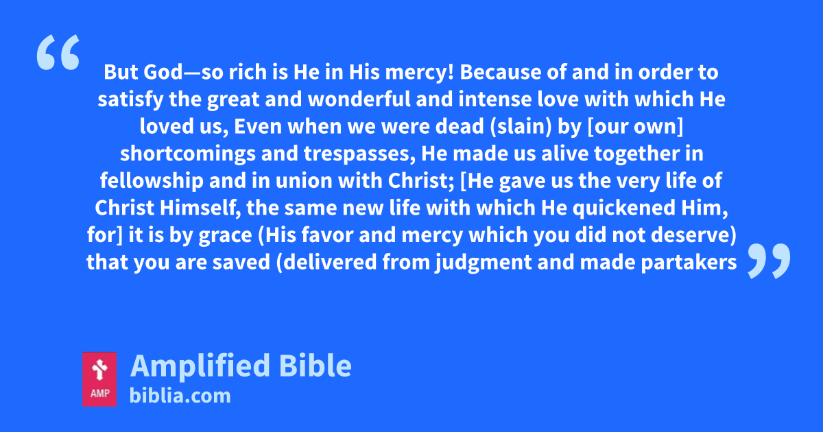 But God—so rich is He in His mercy! Because of and in order to satisfy the great and wonderful and intense love with which He loved us, Even when we were dead (slain) by [our own] shortcomings and trespasses, He made us alive together in fellowship and in union with Christ; [He gave us the very life of Christ Himself, the same new life with which He quickened Him, for] it is by grace (His favor and mercy which you did not deserve) that you are saved (delivered from judgment and made partakers