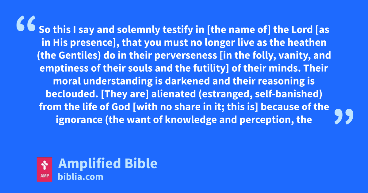 So this I say and solemnly testify in [the name of] the Lord [as in His presence], that you must no longer live as the heathen (the Gentiles) do in their perverseness [in the folly, vanity, and emptiness of their souls and the futility] of their minds. Their moral understanding is darkened and their reasoning is beclouded. [They are] alienated (estranged, self-banished) from the life of God [with no share in it; this is] because of the ignorance (the want of knowledge and perception, the